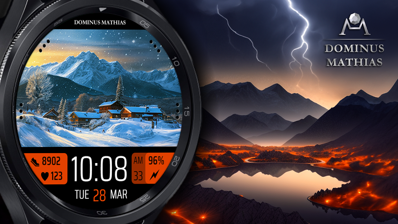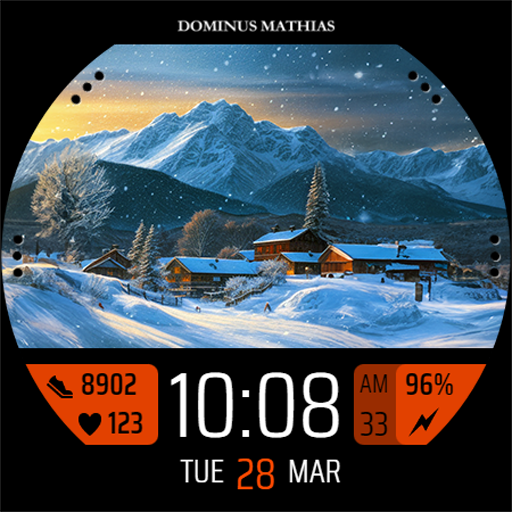 Artistic visual design for Wear OS by Dominus Mathias's watch face. It contains all the most relevant complications as a big and clear digital time, date (weekday, day in month, month), sport, health & fitness data (steps, heart beat), battery level. The logo Dominus Mathias is placed in the top part. The watch face is easy with 4 complications as a shortcuts for launching of desired applications. You have plenty of color choices.