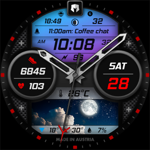 Dominus Mathias 為 Wear OS 5+ 裝置設計了一款獨特的錶盤。它包含所有必要的複雜功能,例如數字時間、日期(日期、星期)、健康數據(心跳、步數)、電池百分比以及兩個可自訂的複雜功能(初始設定為日落/日出和新訊息)。除此之外,您還可以欣賞近 30 張不同的天氣圖片,這些圖片分別顯示天氣狀況和晝夜變化。錶盤還顯示實際溫度、每日最高和最低溫度以及降水/降雨機率(百分比)。您一定也會喜歡四個應用程式快捷方式,可以直接從錶盤介面啟動所需的應用程式。您也可以自由選擇各種顏色組合。要了解有關此錶盤的更多信息,請查看完整描述和所有照片。
