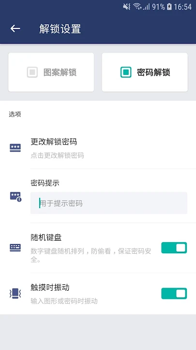 锁应用: 选择密码锁,图形锁。如果你的设备支持指纹识别,且版本为Android 6.0 或更新版本,则可以在照片锁中启用指纹。