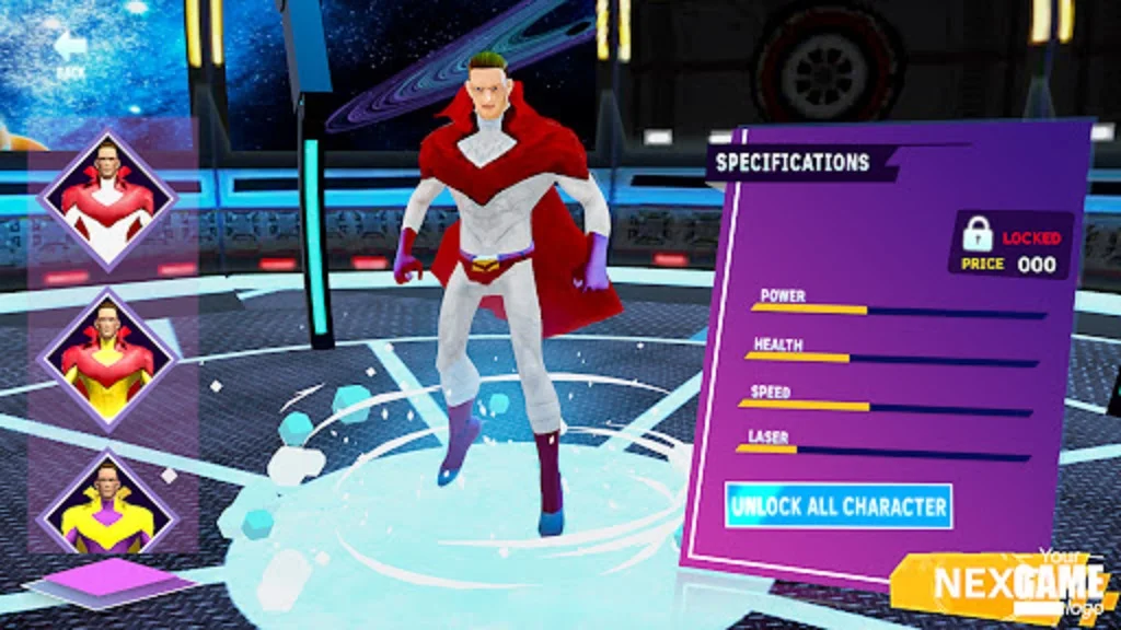 Buy the items required at the store to outfit your hero. Each item will give its superman new skills. Obtain the coolest combination of items for your character to maximize their abilities, such as increased stamina, health, physical damage, accelerated health recovery, bullet and explosion protection, running acceleration, and driving skill.