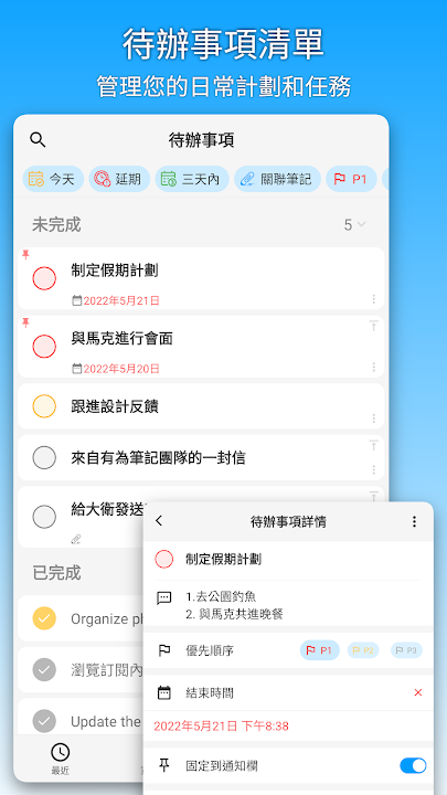• 為待辦事項設定優先順序、結束時間,並將待辦事項固定到系統通知欄。
