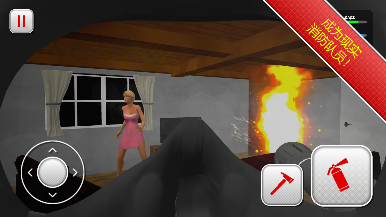 现在你能在大楼内用消防引擎和消防软管灭火,而且它还会带你在复杂的消防员工作环境中更加工作。你需要找到大楼内所有的热点,如果你无法进入火场,你就应该用一把斧子让游戏更加逼真。