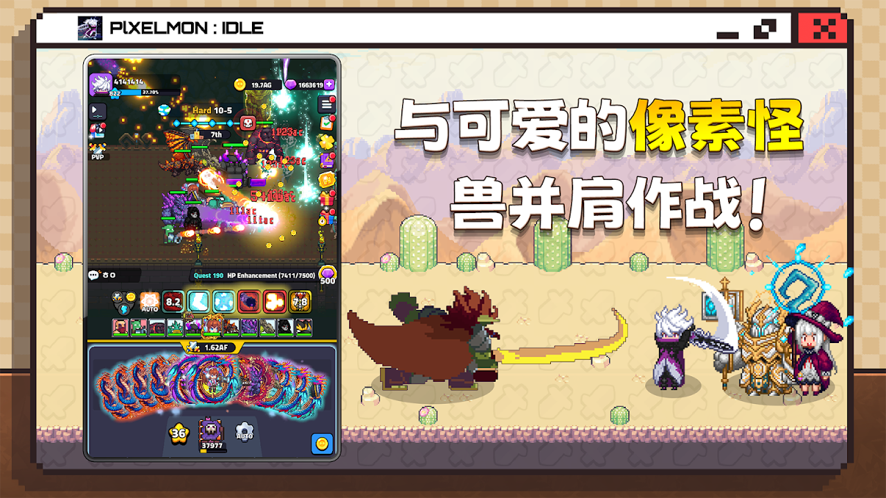 - 無限強化像素怪獸,並使用多樣的裝備和技能,讓牠們變得更強大。