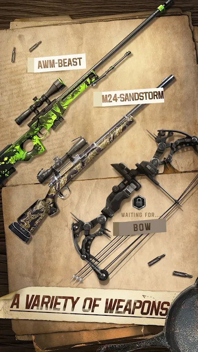 在《狩猎狙击手》中,您将惊叹于种类繁多的武器。体验无与伦比的精准度、精湛的设计和无与伦比的品质,为您的狩猎之旅锦上添花。使用武器代币提升武器性能,让您完美定制您的武器库。不仅如此,您还可以用尖端子弹补充您的装备,解锁丰厚奖励,赢得毕生难忘的奖杯。
