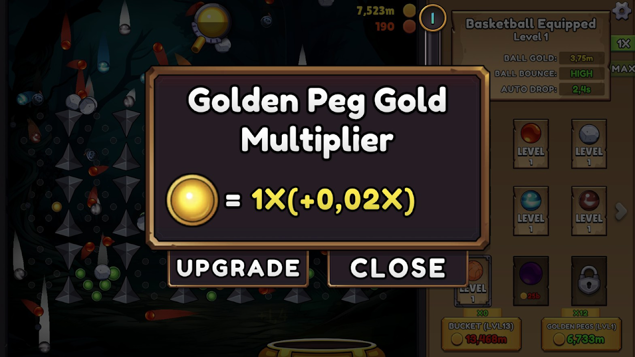 在 PegIdle 中,您的目标是清除棋盘上的棋子。每清除一个棋盘,就会生成一个新的棋盘。每次生成新的棋盘时,每个棋子都有机会成为金棋子、声望棋子或其他独特棋子。击中金棋子可以获得金币,金币可以用来购买新球或升级球。将球扔进移动的桶里也可以获得金币。桶和金棋子都可以升级!