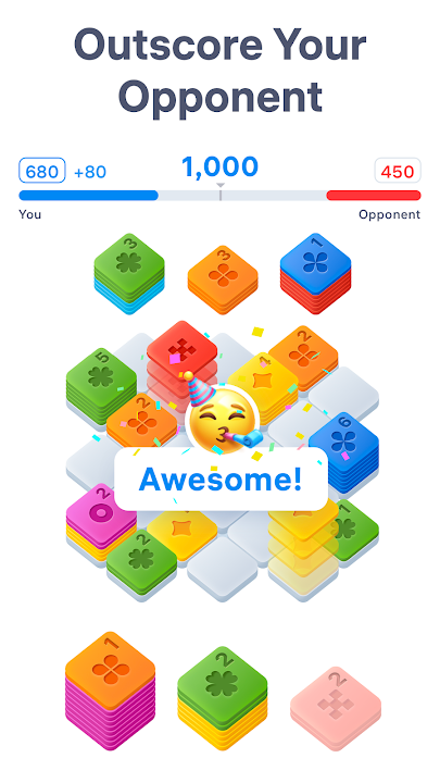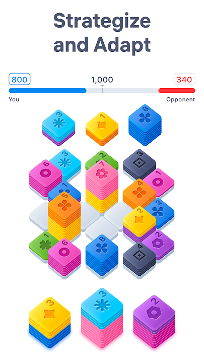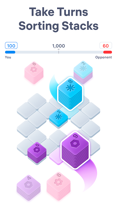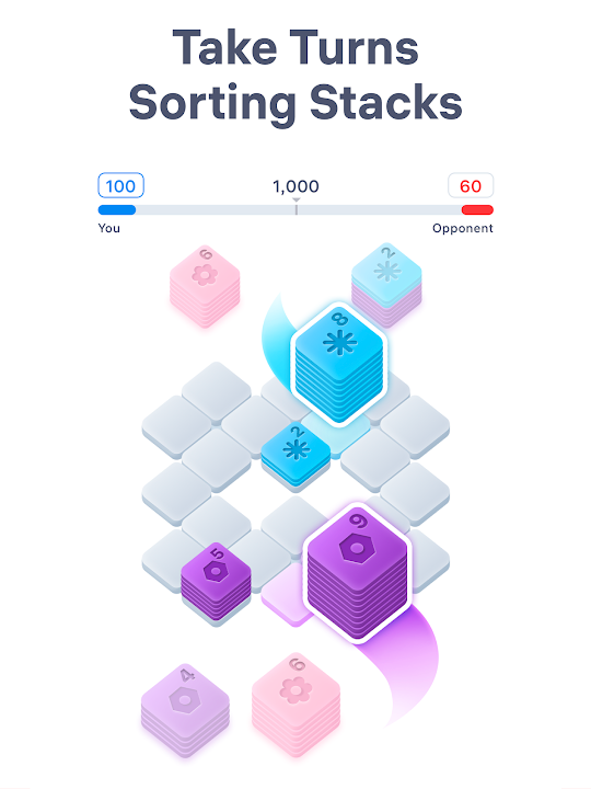 在面对面的比赛中竞争,轮流放置堆叠,并仔细规划您的行动。第一个达到目标的玩家获胜,所以在这款堆叠游戏中,提前思考并超越您的对手。颜色排序捕捉了六边形拼图的策略感,但具有易于掌握的方形方块堆叠和流畅直观的游戏玩法。