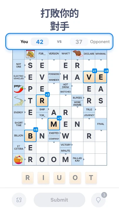- 放置好所有字母後,點擊提交按鈕確認你的選擇。對手是虛擬的,因此你不用浪費時間等待對手的下一步。