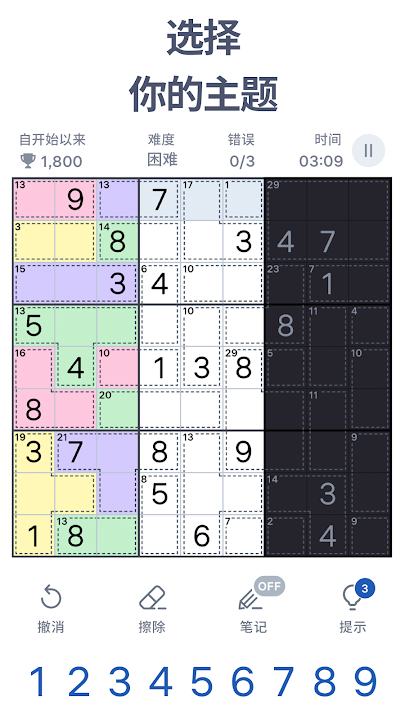 - 颜色主题。选择经典的明亮、暗黑或深褐主题设计您自己的数独王国!