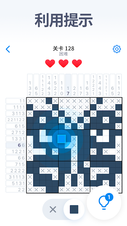 · 数字谜题的目标是填充图片交叉网格,并通过决定给哪些 nonogram 单元格涂色来显示隐藏的图像。