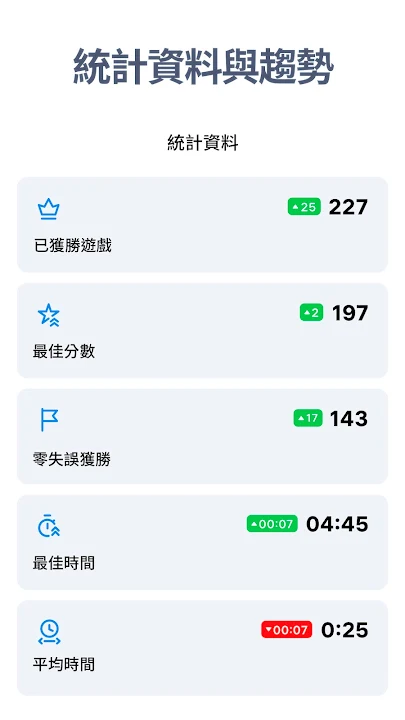 - 統計資料。追蹤您在數獨謎題各個難度中的進度:分析您的最佳時間和其他成就