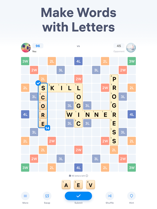 In this word puzzle game, players take turns to compose words with the letters from their deck. Each letter has its own points. The main goal is to reach the highest score by making words on the board with your letters. Unscramble words and sharpen your mind, anytime and anywhere.