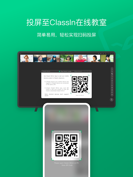 ClassIn投屏是一款简单易用的投屏应用,该应用搭配ClassIn在线互动教室一起使用,将您的屏幕投射到ClassIn在线互动教室中, 轻松实现一键投屏,更好地支持少儿英语、K12、国际教育、留学培训、素质教育以及职业教育等教学场景。