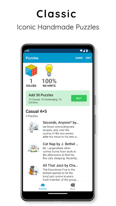 No more erasing! Multi-level undo and Auto-X let you focus on the logic. If you get stuck, you can choose to erase errors, get a logical hint, or view the full hand-worked solution (just like the magazines).