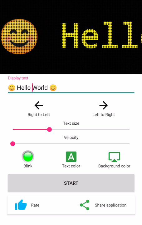 - 编写信息cuaquier表情! - 选择背景颜色,大小,文字颜色和速度 - 按下启动按钮,并准备好了!简单和易于使用的界面