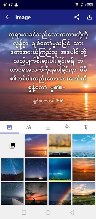 • 當您點擊一節經文時,底部工具列上會顯示一個圖片按鈕。按下此按鈕後,將出現「編輯影像」畫面。您可以選擇背景圖像、在圖像周圍移動文字、更改字體、文字大小、對齊方式、格式和顏色。完成的圖像可以保存到設備並與其他人共享。