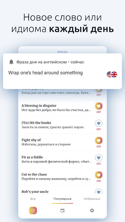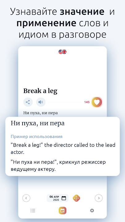每天獲取一個新單詞或短語:成語、短語動詞、俚語或固定表達。英語單詞和習語有翻譯成俄語,並附有含義解釋或俄語對等詞。對於每個單詞和成語,都給出了英語和俄語的應用示例。