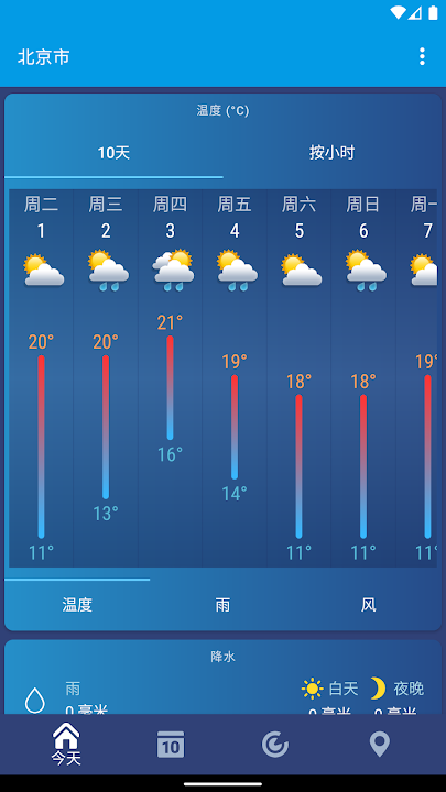• 每小时可用的信息(温度、下雨概率、风速、云量、湿度、压力)
