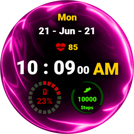 带有动画流体主题的 Wear OS 简单数字表盘。瞥一眼表盘,您将能够看到重要信息(日期、时间、心率、步数和电池百分比)。动画背景创造了一种很酷的效果,让您从其他人中脱颖而出。此外,电池指示灯的颜色会根据电池百分比而变化,让您无需关注细节即可立即了解电池电量。同样,当您达到每日目标时,步数会发出绿光。这是惊人的,但对电池不友好。它支持 12 小时和 24 小时格式的始终显示模式。