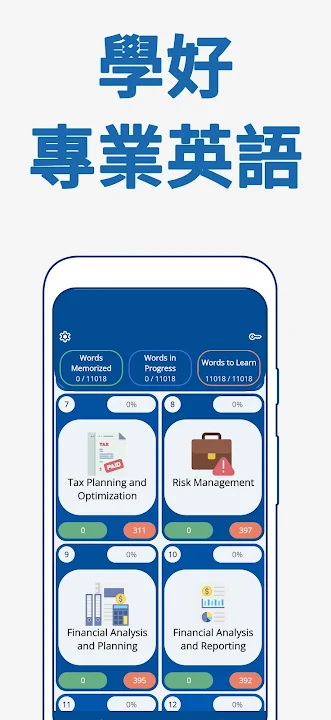 這款應用提供了一個系統化的學習方法,通過八種不同的學習模式,包括實用的學習卡片,能夠有效地幫助你記憶和應用新詞彙。無論是會計英語,銀行英語還是稅務英語,你都可以在這裡找到。學習進度的實時追蹤讓你隨時掌握自己的進步,而詞彙追蹤功能則確保你能夠系統地掌握每一個重要詞匯。