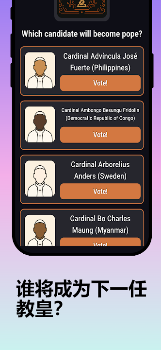 这不是官方投票,与真实的梵蒂冈秘密会议没有任何联系。它不影响实际选举,也不反映枢机主教的决定。该应用程序纯粹是一个用于民意调查的娱乐和趣味工具。