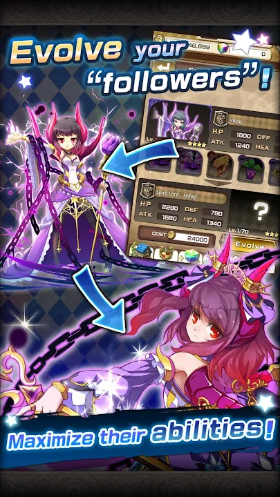 You can play casually in this turn-based battle optimized for one hand mobile play, or you can think hard about the composition, advantages and disadvantages of different followers. Swipe up or down to use super attack or charge your power! Beware! In nightmare level stages, you cannot continue the battle if you fail!