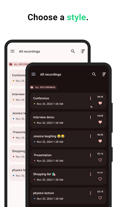 將您的所有聲樂錄製到定義的類別。標記你最喜歡的談話和備忘錄。放置錄音標籤,選擇顏色和圖標。