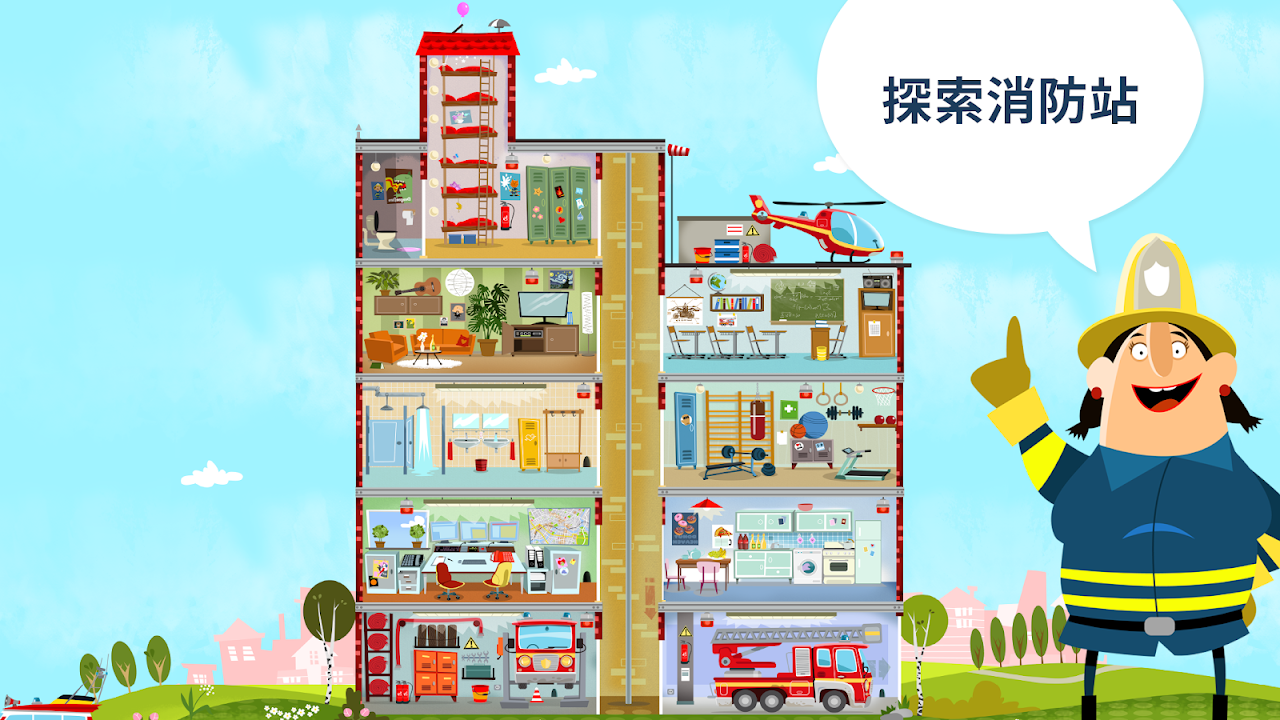 帮助小小消防员执行任务:扑灭火、拯救动物或去经历其他冒险!但这不仅仅只是在做任务——您也可以体验我们小小消防员的日常生活:探索消防站,并与每间房间里的物品、动物及消防队员互动。