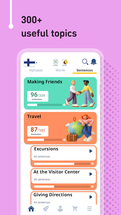 β€’ 5,000 Finnish phrases (frequently used): the most important phrases for daily conversations and travelling, categorized into 10 levels and 120 topics.