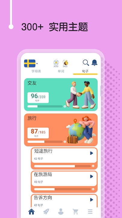 • 5,000个瑞典语短语(常用):日常对话和旅行中最重要的短语,分为10个等级和120个主题。