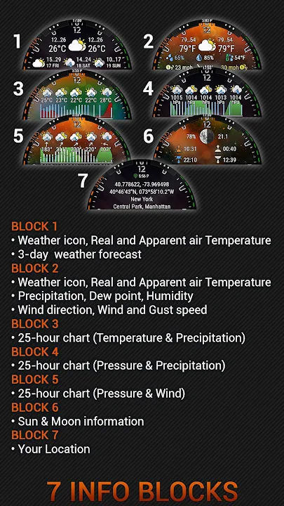 頂部的信息塊可以顯示7種模式(3天預報、當前天氣、3種25小時天氣圖、日月信息、當前位置)。