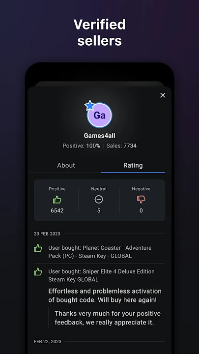• Instant access to thousands of offers – a friend told you about a great game or let you know there’s a promo going for software you’ve been hunting for a long time? You don’t need to go back home to get them, you can buy them right here and now! The G2A.COM app give you access to the entire catalogue, 24/7, wherever you can get Internet access.