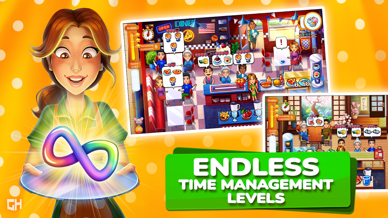Tackle 80 Time Management cooking levels and unlock Endless mode for infinite culinary fun. Challenge yourself with a variety of engaging mini-games, hire handy waitstaff, upgrade menu items, decorate each restaurant, and much more!