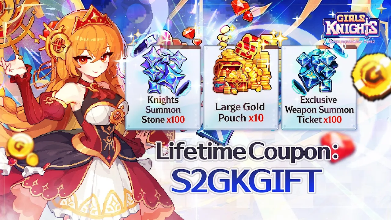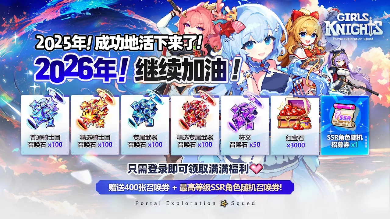 - 骑士召唤券 ×100、专属武器召唤券 ×100、大型金币袋 ×10