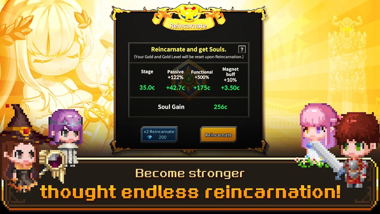Use the materials that you get upon Reincarnation to increase your weapons' Soul Levels.