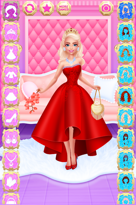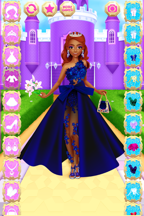 Pick one of the princess girls (each girl has a different skin tone), and then rummage through their huge wardrobe full of dresses, tops, skirts, gloves, diadems, handbags and other clothing items. To finish the makeover, don't forget to select a hairstyle as well. When you're happy with your outfit for the selected princess, tap the "Camera" button to save a screenshot into your Gallery - you can share it with your friends to show off your fashionista talent!