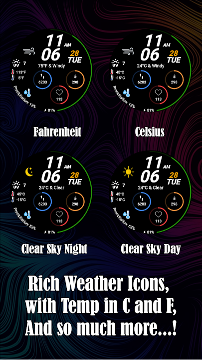 这款表盘上的天气状况图标丰富,配有描述性文字,包括最高和最低温度以及当前温度(根据设置,以摄氏度或华氏度为单位),并显示降水量百分比和紫外线指数……