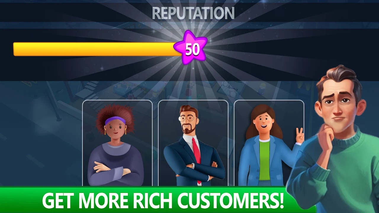 Upgrade the equipment to increase your efficiency in this idle rent game, and make sure the staff management and operations run smoothly. Manage staff and use the earned money to upgrade the premises, and earn money in this real estate game.