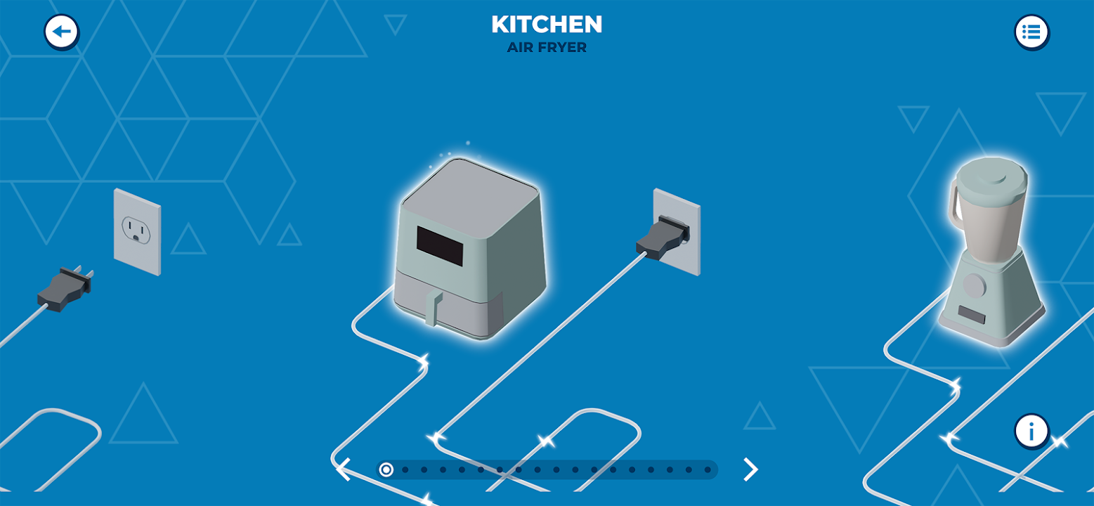 The Learning Power Energy Efficiency Tool allows the player to estimate energy use and cost for appliances and equipment found in a home. The player can choose a room in a house, select an appliance, amount of time the appliance is used, and then see the estimated cost of running the equipment. The player will see which appliances use more energy and the cumulative impact of their choices. As important, the player will learn that by modifying behavior throughout the home, they can impact the amount of electricity they use and money they spend on their electric bill. Even little changes can make a difference in saving electricity and money.