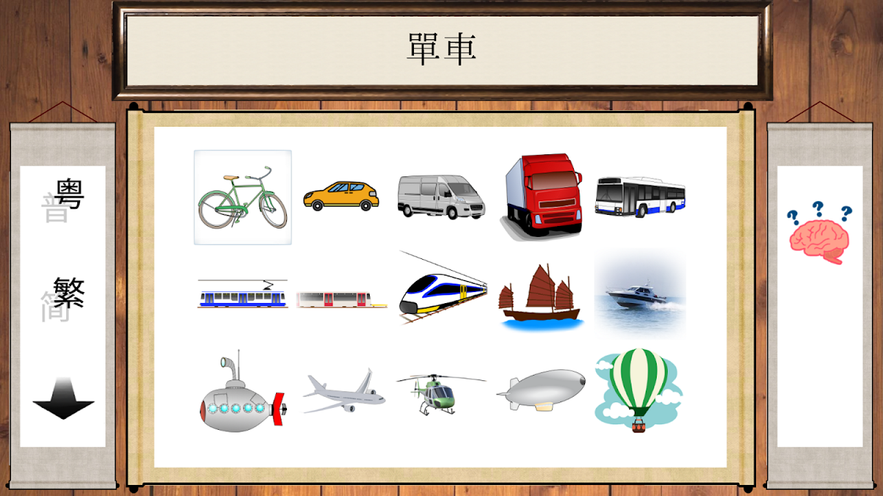 每個主題帶有生動的圖畫,點擊圖畫後會顯示詞語的文字,播出詞語的讀音。