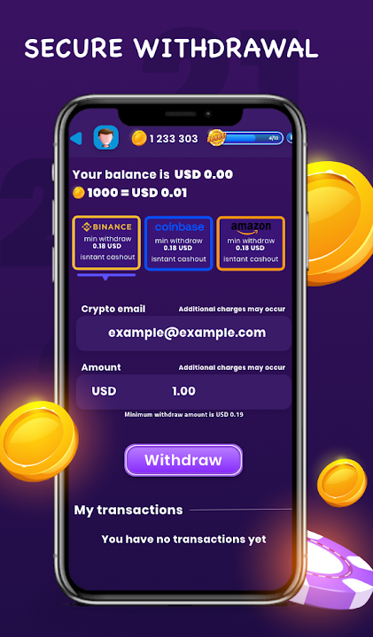 Withdraw directly to PayPal, Coinbase, Binance, Amazon or another virtual wallet.