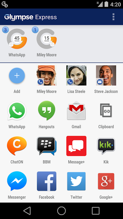 Prefer to send via SMS or email message? Glympse Express has you covered there as well. Select a contact from your address book and Glympse Express creates a shortcut enabling you to send to that contact in the future with just a single tap.