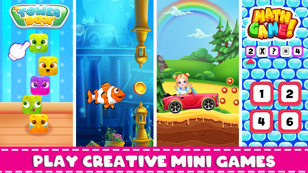 有有趣的迷你游戏可以和宝宝一起玩,比如迷你赛车,用于教育学习和问题解决技能改进的数学拼图,制作塔式应用程序,并保存鱼以有趣的方式教育别致的小女孩。