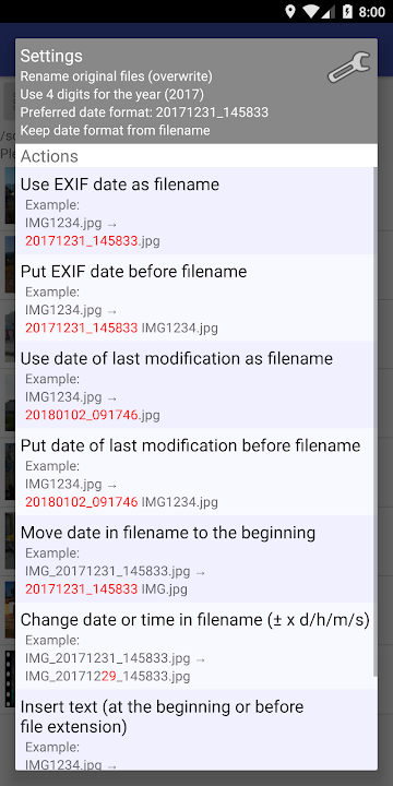 For these reasons, it makes good sense to rename your photos and videos with this app before transferring them to another device (smartphone, tablet or PC), so that all filenames begin with the date taken.