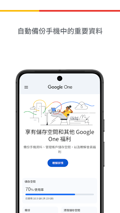 Google One 應用程式可以自動備份你的手機資料,讓你管理自己的 Google 雲端儲存空間。