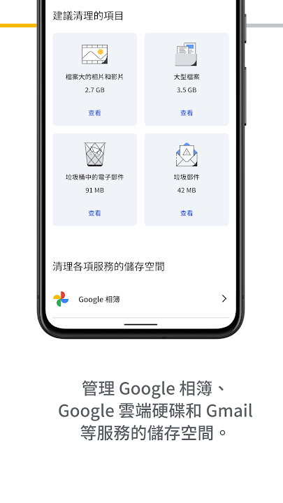 • 管理現有 Google 帳戶的 Google 雲端硬碟、Gmail 和 Google 相簿儲存空間。