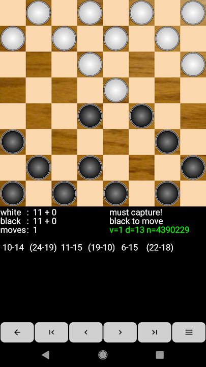 Checkers for Android (draughts) consists of an 8x8 checkers engine and a GUI. The application accepts moves through the touch screen or trackball. An optional "move coach" shows all valid user moves and highlights each last played move. Full game navigation enables users to correct mistakes or analyze games. Games import and export as FEN/PDN to and from the clipboard or via sharing, or are set up through a position editor. The engine plays at various levels (including random and free-play). By popular request, an option was added to select between mandatory captures (the official rule) or optional captures (a common home rule, but without "huffing", where the piece that should have performed the capture is forfeited; instead the game simply continues). The user can play either side and, independently, view the board from the perspective of white or black.
