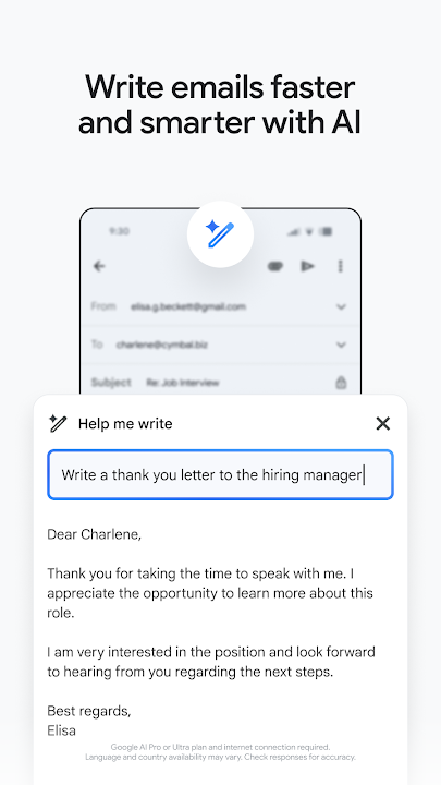 • Use Gemini* as your AI powered writing assistant right from your inbox, with built-in features like ‘Help me write’ and contextual Smart Reply