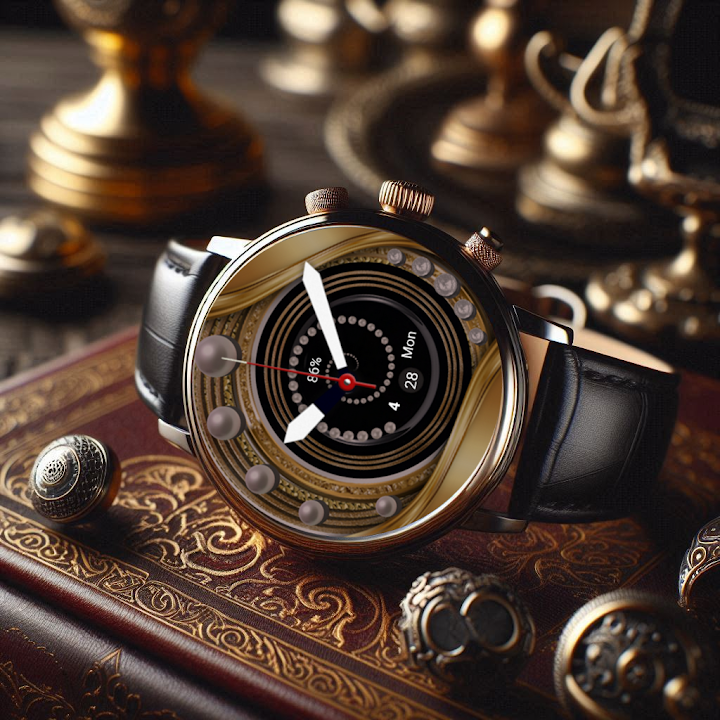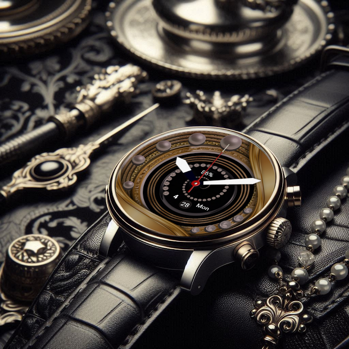 為您的手腕增添純粹的奢華!高級金色錶盤為您的 Wear OS 智慧手錶帶來無與倫比的優雅。具有令人驚嘆的黃金質感、美麗的珍珠、閃閃發光的鑽石和基本的數位複雜功能(電池、日期、星期)。