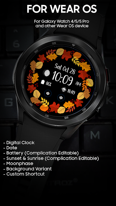 Wear OS 的秋季主題錶盤。特徵 :1. 數字時鐘2. 日期3. 電池(複雜度可編輯)4. 日落和日出(複雜功能可編輯)5.月相6. 背景變體7. 自訂快捷方式