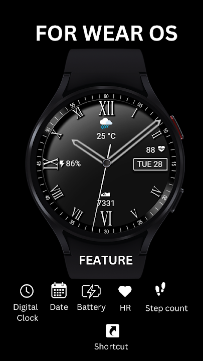适用于 Wear OS 的经典 Signature 4 表盘。特征 :1. 模拟时钟2. 日期3. 电池4、人力资源5. 计步6. 天气7. 快捷方式8. 背景和颜色变化9.AOD